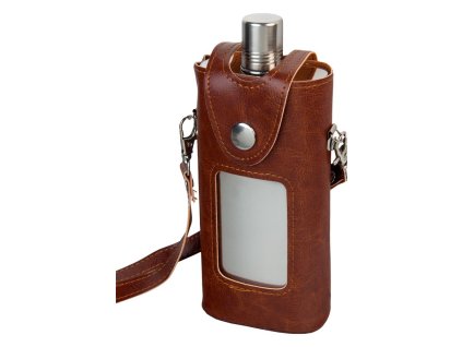 Nerezová likérka zasazená v otevíracím pouzdru ve tvaru uzavíratelné peněženky s řemínkem kolem zápěstí.