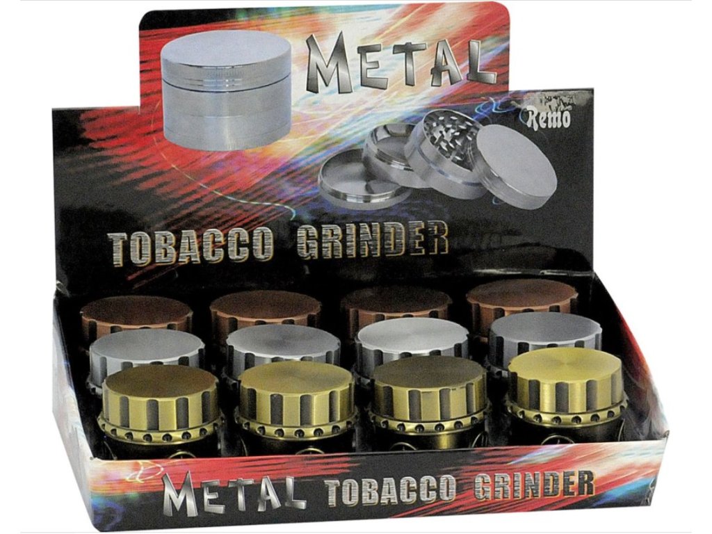 Čtyřdílná kovová drtička, doplněná plastovou lžičkou.