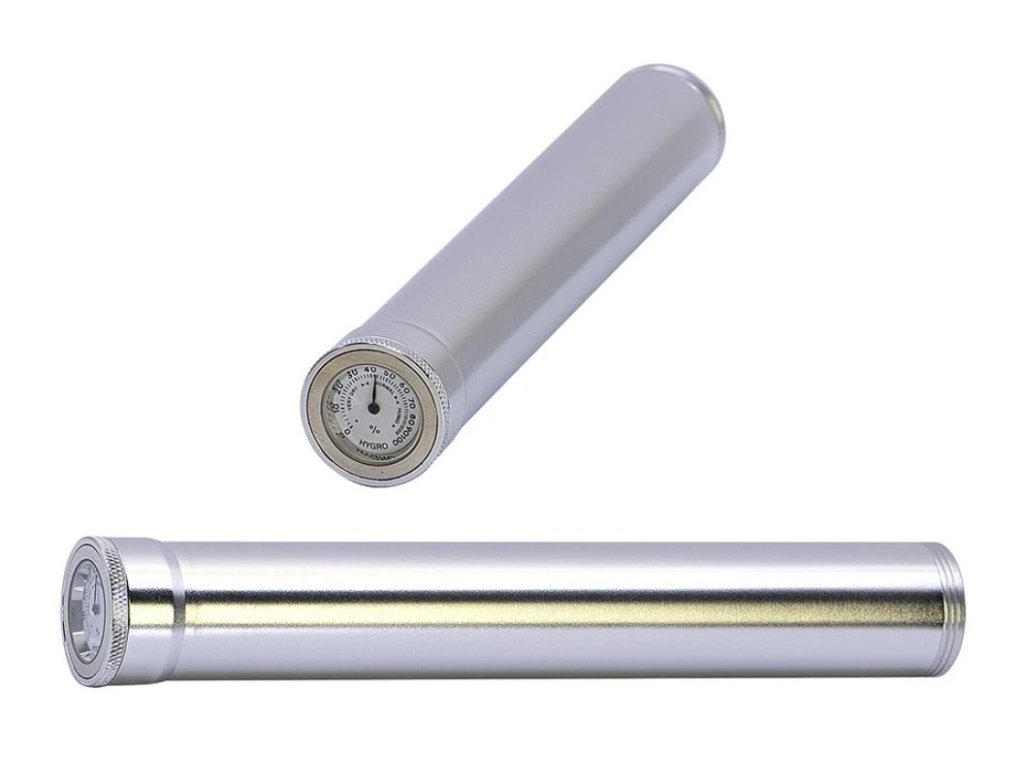 Ochranné pouzdro na doutník v stříbrné barvě, součástí je vlhkoměr ve víčku