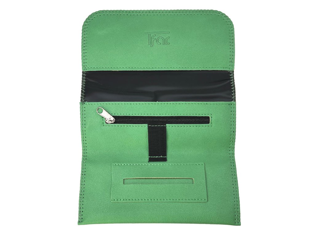 Po rozevření pouzdra je uvnitř kapsička na papírky, gumové poutko, dvě menší kapsy, z toho jedna na zip a velká kapsa na úschovu tabáku. Vnitřek je podšitý PU folií pro uchování aroma a kvality tabáku.